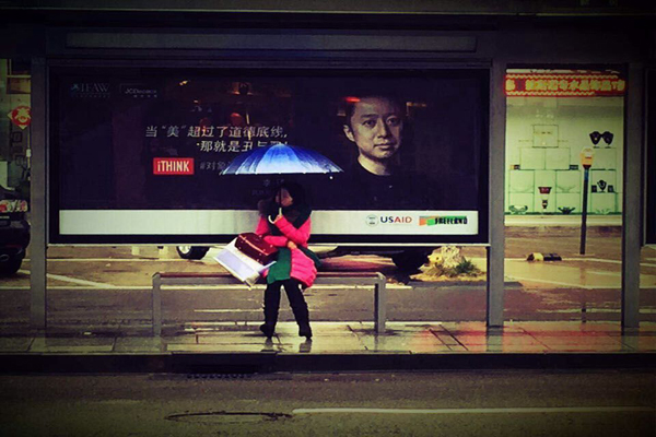 今天下雨,天一廣場(chǎng)公交車站,大幅廣告牌下,紅衣女子在等待......