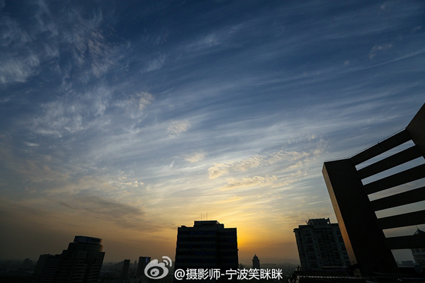 傍晚日落時分,寧波高空明麗的蔚藍色,流動的云朵在空中隨風翩翩起舞,時而金黃,時而潔白,時而象火一樣紅,很少看見這么美的天空。