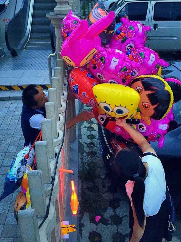 2015.8.10 晚上手機攝于婦女兒童醫院,賣氣球的小販隔著圍墻做生意!