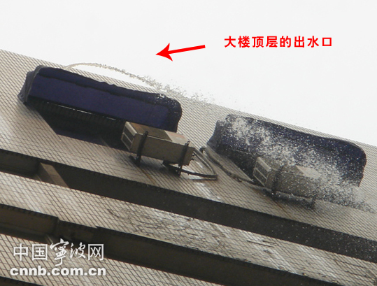 中國寧波網訊(記者 王麗旻) 8月13日下午甬城下起瓢潑大雨,15:05,記者接到網友爆料,說在寧波靈橋廣場一側,可以看到“瀑布”。記者隨即趕到寧波藥行街上的靈橋廣場,果真在現場看到了這位網友形容的情景,一股水流從天而降,記者抬頭查看了水柱的源頭,原來是大廈12樓的一根出水管正在往下澆水,在重力加速度的沖擊下,人行道上地上濺起一地的水花,過往的路人都紛紛躲閃。一旁愛建證券公司門口的保安告訴記者:“天晴的時候都是好好的,以前下大雨時也沒有遇到這樣的情況,這樣的事情還是第一次發生。”