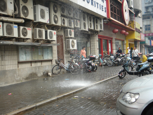 “瀑布”灑在人行道上,過路行人避之不及