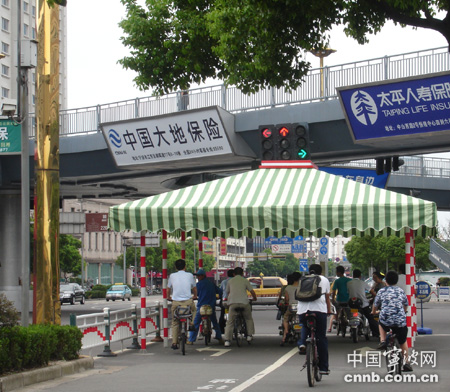 中國寧波網訊(記者王麗旻)近日,記者在街頭發現,久久天橋紅綠燈前多了一頂綠色的遮陽棚,碰到紅燈時,騎車的市民都停在線內安心地等待綠燈通行。小小遮陽棚為炎炎夏日出行的甬城市民,撐起一片清涼的天空。