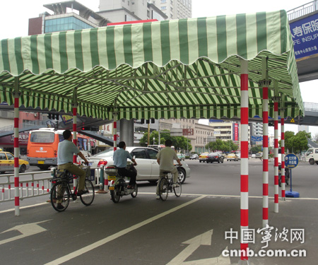 據記者了解,在上海、杭州、紹興等地都有設過類似的“遮陽棚”。這一措施在寧波也并非首例了,早在2006年,琴橋西堍路口的東南側非機動車道上也有安裝過。今年,交警部門聯合城管部門在久久天橋設立試點,這一遮陽棚如有效果,將在市區其他路口推廣。