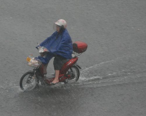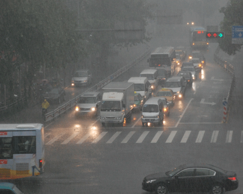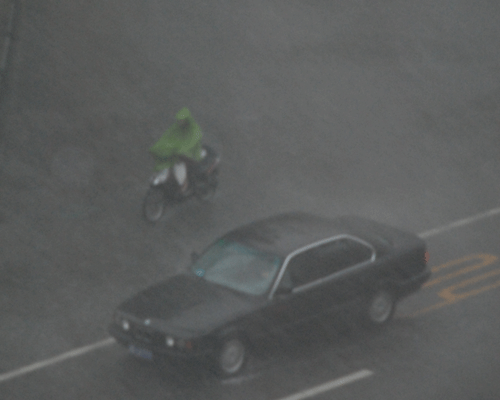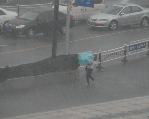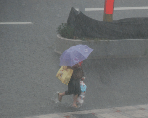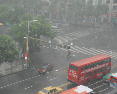 馬路上已經有了很深的積水。路上的行人都沒有準備。