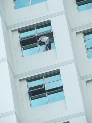 下午3點(diǎn)多,江東李惠利醫(yī)院住院樓下圍滿了人群,抬頭可見住院樓11樓的窗戶上掛著一名男子。男子雙腿踩在玻璃外面的窗臺上,雙手抓著玻璃窗,稍有不慎可能就掉下來,情況十分危險。