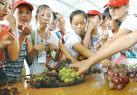 圖為參加夏令營的小朋友們在“爭搶”剛采摘下來的葡萄。