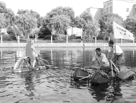 于漢頤把兩個(gè)長(zhǎng)2.3米、寬1.1米的鐵腳架安置在自行車上,用純凈水水桶和大腳盆作載重浮力。一輛車用10個(gè)空的純凈水水桶組成,每個(gè)水桶可載重18公斤,保證自行車載重在180公斤(圖左)。另一輛是用8個(gè)大腳盆載重的,每?jī)蓚(gè)腳盆用玻璃膠粘合,再用螺絲釘固定住。兩個(gè)腳盆之間塞滿了空的可樂瓶,作為雙重保險(xiǎn)。然后把水桶和腳盆夾到鐵腳架上,用鋼絲和布繩綁牢,在自行車的踏板上固定兩塊劃水板(圖右)。在水上踩起來(lái),別有感覺,很開心。
