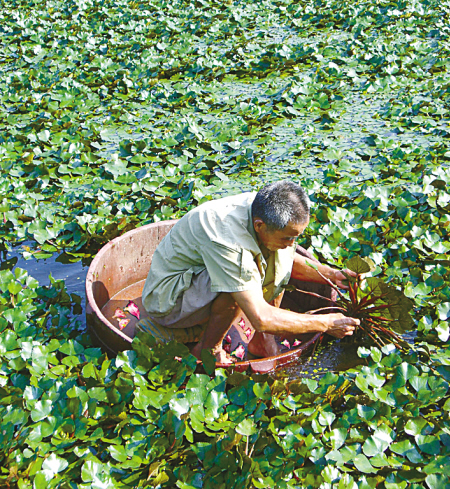 近日,寧波市場上各種水菱開始大量上市。水菱是人們喜歡的果蔬類食品,鮮菱角生食能消暑熱、止煩渴;菱角熟食能健脾胃、益中氣。鎮海區駱駝街道妙勝村利用水塘種植的各種水菱暢銷市場,取得了很好的收益。圖為村民在采紅菱。(李 平 攝)