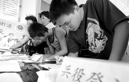 昨天上午,江東區白鶴街道兵役登記站內,許多適齡青年正踴躍參加兵役登記。根據《中華人民共和國兵役法》和《征兵工作條例》,一年一度的兵役登記、頒發《公民兵役義務證》工作近日在我市全面展開。兵役登記是征兵前的基礎性工作,是保證兵員質量的重要一環。