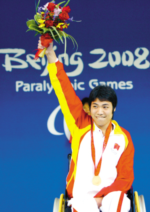 9月7日,浙江選手杜劍平在國家游泳中心進行的北京2008年殘奧會S3級男子100米自由泳決賽中以1分35秒21的成績,打破世界紀錄并獲得冠軍,這是中國代表團在北京殘奧會上獲得的首枚金牌。新華社