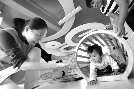 昨天上午,江東區(qū)早期教育實驗中心的一名老師,正在引導一名一歲半的孩子做互動游戲。從昨天起,江東區(qū)教育局將在全市率先向戶籍在區(qū)內(nèi)的1000名嬰幼兒及家長免費提供“早教”服務。