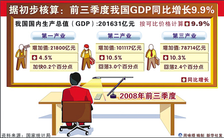 據(jù)新華社北京10月20日電 國家統(tǒng)計(jì)局新聞發(fā)言人李曉超20日說,據(jù)初步核算,前三季度國內(nèi)生產(chǎn)總值201631億元,按可比價格計(jì)算,同比增長9.9%,比上年同期回落2.3個百分點(diǎn)。前三季度,我國居民消費(fèi)價格總水平(CPI)同比上漲7.0%,漲幅比上半年回落0.9個百分點(diǎn),其中,城市上漲6.7%,農(nóng)村上漲7.7%。
