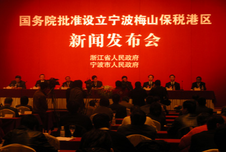 新聞發布會上,浙江省副省長鐘山宣讀了國務院批復文件,寧波市市長毛光烈介紹了寧波梅山保稅港區的有關情況。毛光烈指出,寧波梅山保稅港區的批準設立是國家堅持繼續推進改革開放的一項新的具體舉措,進一步完善了浙江擴大開放的新格局,有利于寧波加快現代化國際港口城市的建設。
