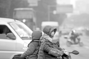 昨天傍晚,一位市民戴著厚厚的口罩騎車從靈橋西駛過。記者王鵬攝