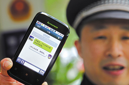 海曙區鼓樓派出所李警官正在接收一名外來人員辦理居住證的微信。(胡建華攝)