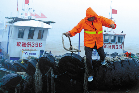 昨天下午2時半,在象山石浦漁港碼頭,一位漁民冒著大雨上岸,準備停泊漁船,以躲避“鳳凰”。 (徐能俞莉陳光曙攝)