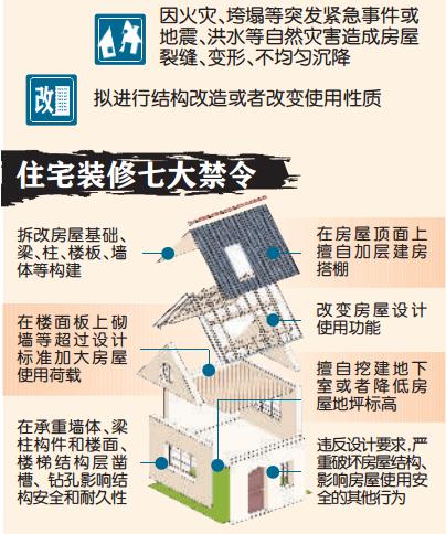 此次修訂草案加大了對危害房屋安全行為管理和處罰力度。具體來說就是進一步明確了住宅房屋裝修中需禁止的七種行為。一旦發現有違反禁令的住宅房屋,最高可罰10萬元。(詳見右圖表)