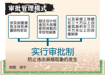 鄭世海說,除了明確禁止的行為外,還設置了審批管理模式,就是對涉及房屋建筑主體和承重結構變動或者超過設計標準加大房屋使用荷載的非住宅裝修,以及裝修工程額在三十萬以上且建筑面積在三百平方米以上的房屋裝修,實行審批制,防止違法裝修現象的發生。東南商報記者張昊