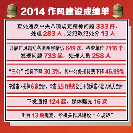 加強會所整治、禁止公款送禮、通報違紀案例……過去一年,這一系列的新氣象贏得了甬上百姓的擊掌稱贊。自中央八項規定出臺以來,寧波市強力開展各項專項整治,共查處違反中央八項規定精神問題811件、處理536人,其中去年一年查處問題333件、處理283人。全市紀檢監察部門以從嚴執紀、狠剎“四風”的高壓態勢,形成了對不正之風“零容忍”的新常態。