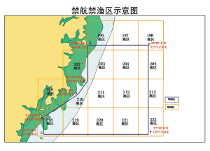 包括196、197、198、202、203、204、205、209、210、211、212、213、218、219、220、221、222共17個漁區。實際使用武器訓練期間,嚴禁船舶駛入上述各點連線范圍內水域,北上和南下的船只從123°12′00″E線以東海域航行,并聽從外圍警戒艦艇的指揮,以策安全。