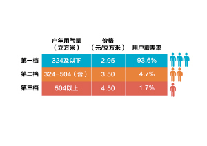 居民階梯氣價制度以戶為單位(對應的家庭戶籍人口為4人),以年度為計量周期,確定三檔氣量和對應的價格,各檔價格按用氣量實行超額累進加價。第一檔、第二檔、第三檔年用氣量分別為324立方米及以下、324立方米至504立方米(含)、504立方米以上,對應的價格分別為每立方米2.95元、3.5元和4.5元。按2014年寧波市區居民用戶實際用氣量數據測算,各檔氣量用戶覆蓋率分別達到93.6%、4.7%及1.7%。階梯氣價方案按照“;、促節約”的原則確定。各檔氣價比價關系基本保持在國家發展改革委指導意見要求的1:1.2:1.5水平。