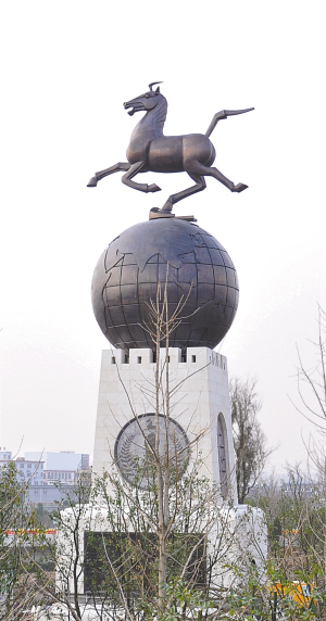 中國優秀旅游城市標志———“馬踏飛燕”雕塑是工程的一大亮點,即將安裝在高速北側轉盤綠地中。雕塑主體由紫銅鍛造的銅馬和地球、花崗巖飾面的烽火臺和基座四部分組成,其中基座高5.9米,烽火臺高6.7米,地球造型直徑7米,馬高6.85米。雕塑造型氣勢恢宏、莊重明快。