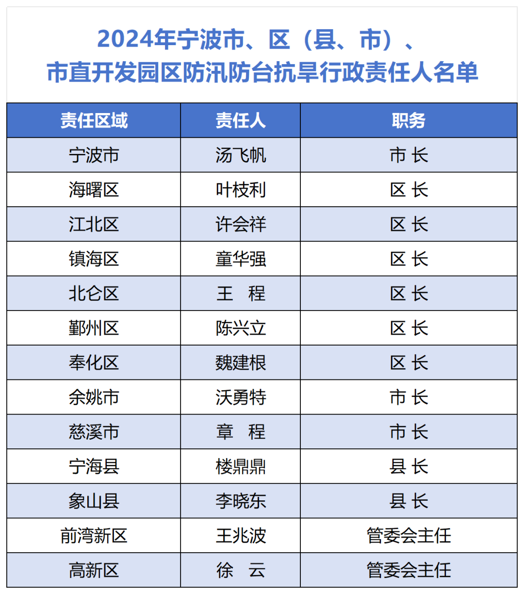 寧波市人民政府防汛防臺抗旱指揮部公布2024年度防汛防臺抗旱行政責任人及“市領導包縣”“縣領導包鄉”包保責任人名單。