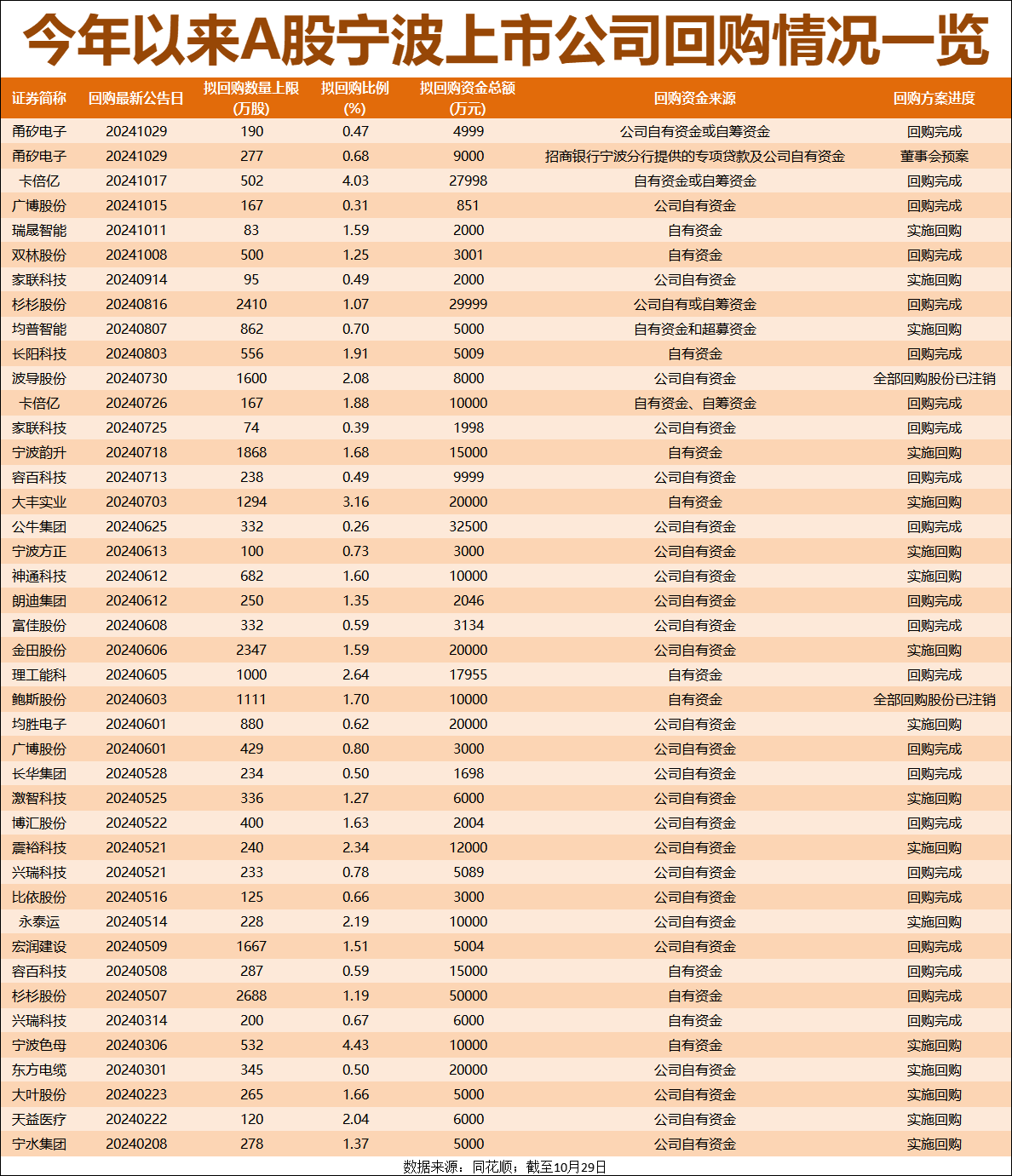 截至10月28日,今年以來,已有40家寧波上市公司實施股份回購,累計金額達37.21億元,較去年全年增長112.51%;8家寧波上市公司擬實施中期分紅,合計12.79億元。分紅家數較去年同期翻了兩番,分紅金額較去年同期增長約10倍。