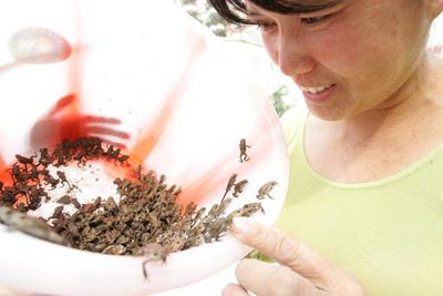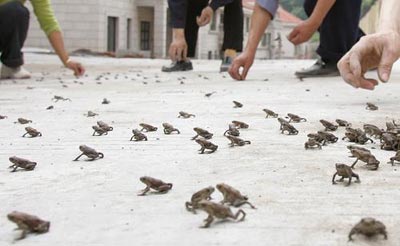 2006年4月27日,重慶南坪四秀小區,人們好奇地在馬路上捉捉小蛤蟆玩耍。當日,萬多只小蛤蟆爬上馬路呼吸新鮮空氣。