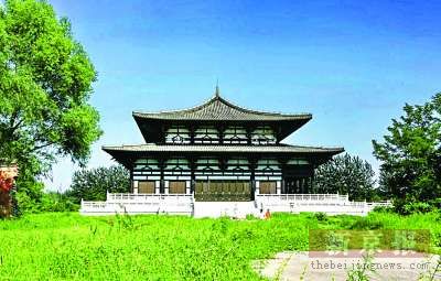 東大殿像一座巨大的古代廟宇,用米、褐、黑三色裝飾,飛檐高翹,雄偉壯觀。
