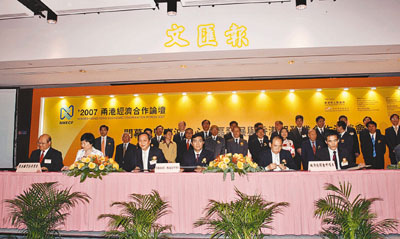 -“2007甬港經濟合作論壇”在港舉行,寧波港集團總裁李令紅(左四)與寧波市代表簽約。