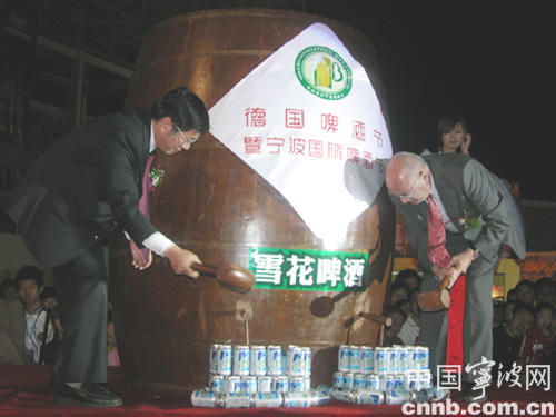 寧波市副市長成岳沖先生和德國拉爾地區城市聯盟市長瓦爾特·卡羅黎博士共同開啟啤酒桶閥門