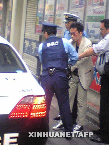 這張由一名行人在6月8日拍攝的照片顯示,日本東京秋葉原惡性傷害事件犯罪嫌疑人加藤智大(中)被警察逮捕。