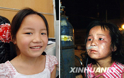 左圖:傷愈重返課堂的高雅倩面露微笑(5月27日攝)。右圖:地震中受傷的高雅倩在重慶市梁平縣人民醫(yī)院設(shè)在戶外的臨時(shí)病房接受治療(5月13日攝)。