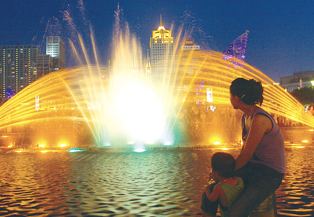 昨晚,市民在流光溢彩的天一廣場噴水池邊納涼。市民切身感受到甬城面貌日新月異,大家的文明素質(zhì)也越來越高了。(記者周建平攝)