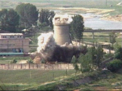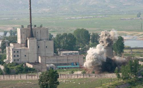 6月27日,在朝鮮核工業重地寧邊,20多米高的核設施冷卻塔在煙塵中倒塌。朝鮮當地時間27日17時05分(北京時間16時05分),寧邊地區核設施的冷卻塔被炸毀。 新華社記者 高浩榮 攝
