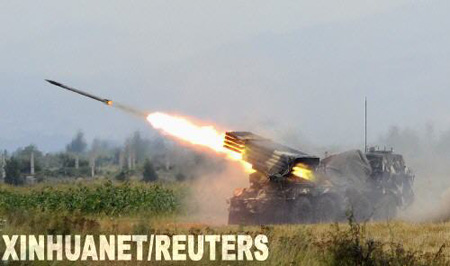 8月8日,格魯吉亞軍隊在南奧塞梯首府茨欣瓦利市附近發射火箭彈。新華社/路透