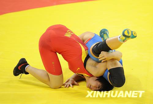 8月17日,在中國農業大學體育館舉行的北京奧運會摔跤女子自由式72公斤級決賽中,中國選手王嬌(紅)戰勝保加利亞選手絲坦卡·茲拉特娃,奪得冠軍。新華社記者李鋼攝