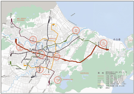 按照國務院批復精神,我市軌道交通線網以三江片為核心,以跨三江、連三片、沿三軸為指導思想構成了三主三輔六條線、放射狀的軌道交通線網,線網全長247.5公里,共設換乘站19座。規劃線網在城市周邊留有充分的發展條件。