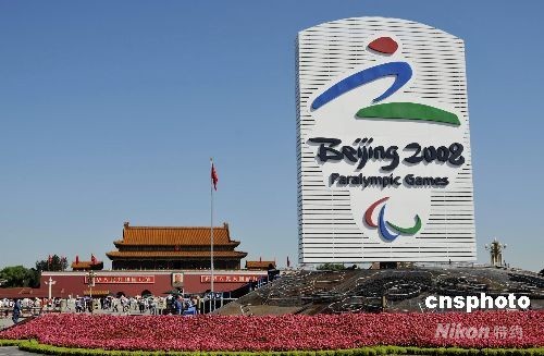 9月1日,北京2008年殘奧會會徽“天地人”屹立在北京天安門廣場。會徽以天、地、人和諧統一為主線,把中國的文字、書法和殘疾人奧林匹克運動精神融為一體,集中體現“心智、身體、精神”和諧統一的殘疾人奧林匹克運動精神,具有深厚的中國傳統文化底蘊。殘奧會開閉幕式將分別于9月6日和17日晚8點在北京的國家體育場“鳥巢”舉行。中新社發王宇婷 攝