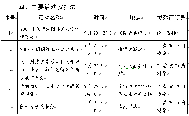 由2008中國國際工業(yè)設(shè)計展覽會、第三屆“鎮(zhèn)海杯”國際工業(yè)設(shè)計大賽、設(shè)計對接交流活動日、院士專家企業(yè)行等四項內(nèi)容組成。