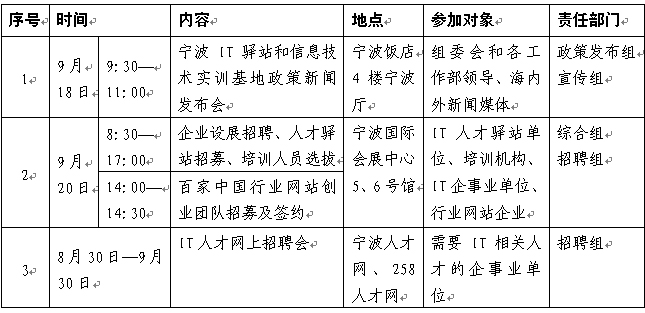 IT服務外包人才驛站共分四項分體活動:一是IT服務外包人才引培現(xiàn)場招募會,組織IT人才驛站單位、培訓機構、IT企事業(yè)單位(共30個標準展位)參會;二是百家中國行業(yè)網(wǎng)站創(chuàng)業(yè)團隊招募及簽約,發(fā)揮寧波集群行業(yè)經(jīng)濟和中小企業(yè)眾多的優(yōu)勢,利用中搜行業(yè)中國平臺,通過自建行業(yè)供應、求購、招商、合作等信息發(fā)布功能較為完備的行業(yè)網(wǎng)站,實現(xiàn)行業(yè)網(wǎng)站與產業(yè)的有機結合。通過行業(yè)域名、辦公用房、中搜行業(yè)中國平臺、網(wǎng)站推廣及創(chuàng)業(yè)企業(yè)管理服務等互聯(lián)網(wǎng)創(chuàng)業(yè)的系列套餐,甄選和動員已入駐中搜行業(yè)中國平臺的行業(yè)網(wǎng)站及有意創(chuàng)業(yè)的人才落戶寧波,推進百家中國行業(yè)網(wǎng)站企業(yè)落戶寧波工程;三是IT人才網(wǎng)上招聘會,組織市軟件企業(yè)、IT服務外包企業(yè)、市IT行業(yè)用人單位及需要IT相關人才的企事業(yè)單位參加;四是IT人才驛站及信息產業(yè)實訓基地政策發(fā)布,主要通過新聞發(fā)布會、政策匯編分發(fā)、有關人才招聘網(wǎng)站等途徑集中發(fā)布寧波市IT人才驛站和信息技術實訓基地等優(yōu)惠政策。