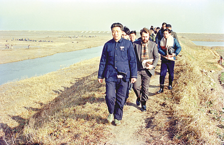 圖為1983年世界糧食計劃署官員羅伯特先生視察聯合國援建的慈溪四灶浦萬畝魚塘工地。(俞丹樺 攝)