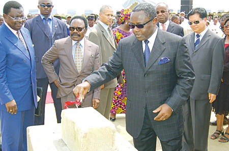 寧波華州礦業投資有限公司獲得加蓬共和國2000平方公里錳礦的開采權,這是寧波規模最大的境外資源開發項目之一。圖為2007年12月12日,加蓬共和國總統哈吉·奧馬爾·邦戈(前排左三)出席該項目的開工儀式。 (市外經貿局 供稿)