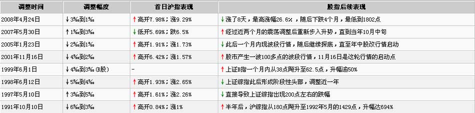 概念:證券交易印花稅是股民從事證券買賣所強制繳納的一筆費用,根據一筆股票交易成交金額計征。 作用:印花稅率的高低可以直接地改變股票的交易成本,因此監管層通過調整印花稅率可以起到調控股市的作用。回顧:1999年以來,中國證券印花稅率經歷了7次調整。過去只有一次是上調,趨勢是逐步降低,由6‰逐漸降至1‰。 近年最為著名的調整是在2007年5月30日,當日凌晨,財政部決定將現行的1‰印花稅調整為3‰。當天,滬綜指暴跌6.5%,兩市跌停的非ST類個股超過850只。