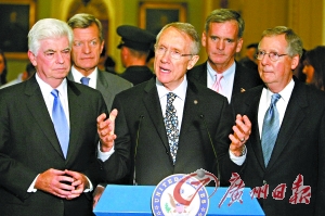 美國國會參議院多數黨領袖里德(前中)、參議院少數黨領袖麥康奈爾(前右)、參議院銀行、住房和城市事務委員會主席克里斯托弗·多德(前左)在對修改后的金融救援計劃投票后出席新聞發布會。 新華社發