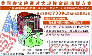 美國國會參議院當地時間1日晚(北京時間10月2日上午)投票表決通過了數千億美元的金融救援計劃。眾議院定于3日投票表決。能否使眾議院最終通過該方案,是布什政府和國會兩黨領袖目前面臨的最大挑戰。