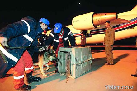 本報記者賈婷攝影報道昨晚10點30分,國家地震救援隊隊員以及武警總院的8名醫護人員乘坐軍用RJ公務機從西苑機場起飛奔赴新疆伊犁昭蘇縣地震災區。這次救援隊出發除攜帶好幾箱基本救災器械外,還照例帶上兩只搶險救災專用的黑貝犬(右圖)。昨天,救援人員和醫護人員都穿著厚重的羽絨制服,醫生們還準備了數個救生擔架和帶有紅十字標志的急救包。