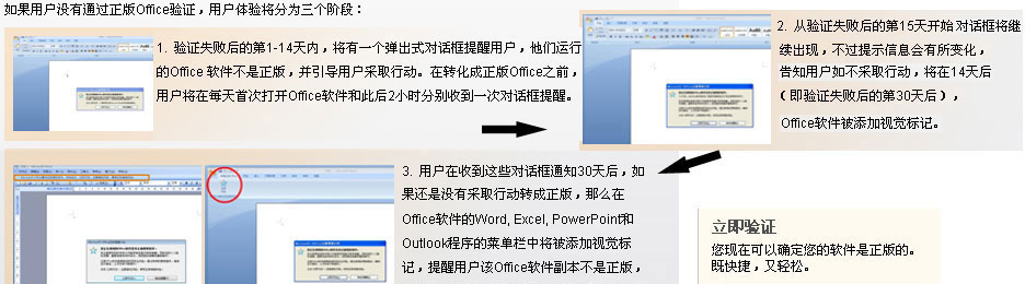 通過WGA服務可以讓用戶驗證自己所用的系統是否為正版。WGA早在05年就已推出,10月20日是新一輪投放,只針對XP專業版。OGA用來驗證Office是否為正版,屬首次面世,中國是OGA首批投放的國家之一。