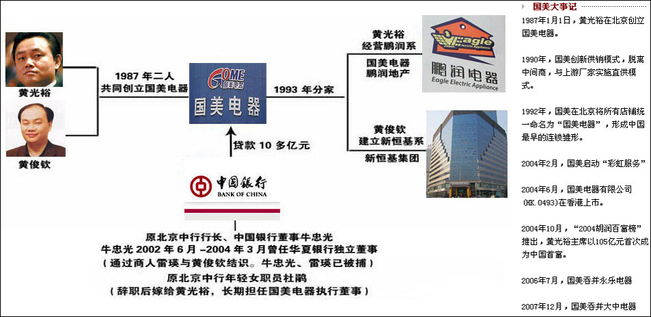 黃光裕1969年生于汕頭。17歲隨其兄弟到京,貸款開始了家電經(jīng)銷,創(chuàng)立國美。1999年,黃光裕創(chuàng)辦鵬潤投資,在幕后資本運作,并購涉及大中、永樂、三聯(lián)商社等。黃光裕三度成為 胡潤百富榜 首富。早在2006年,黃光裕兄弟就曾卷入“原罪”是非。